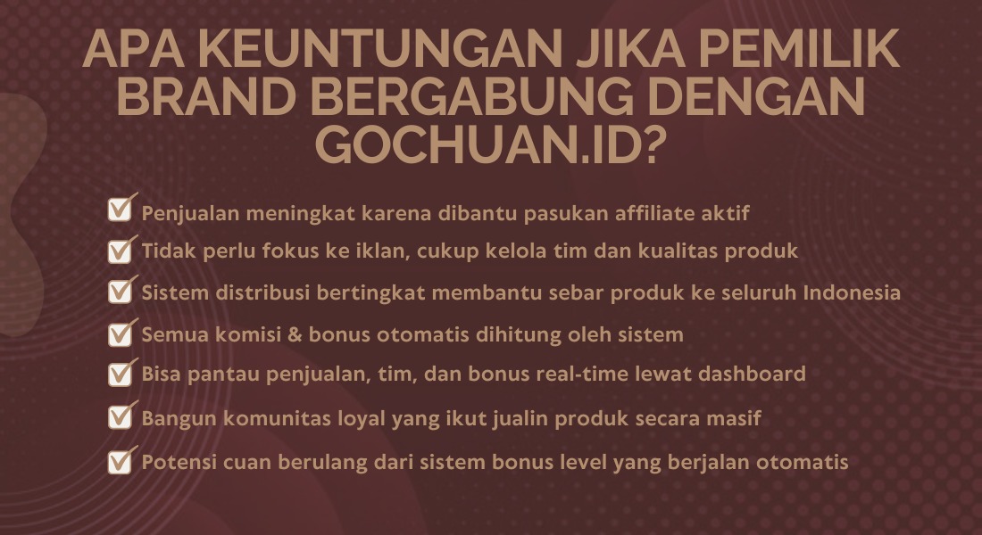 Gochuan.id adalah platform yang menghubungkan owner bisnis dengan affiliate marketer untuk menciptakan peluang penghasilan yang besar. Dengan sistem bonus hingga 20 level, Anda bisa mendapatkan cuan setiap hari hanya dengan membagikan link!